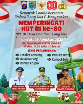 Dalam rangka memperingati Hari Ulang Tahun ke-80 Kemerdekaan Republik Indonesia, Polsek Long Ikis menggelar berbagai lomba rakyat bersama masyarakat Desa Pait. Kegiatan berlangsung di halaman Mako Polsek Long Ikis, RT 01 Desa Pait, Kecamatan Long Ikis, pada Jumat (29/8/2025) pukul 14.00 WITA hingga selesai.