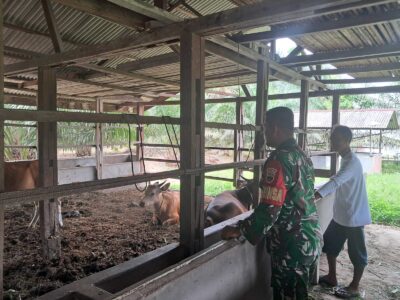 22 September 2025 — Dalam rangka menjaga kesehatan hewan ternak serta mencegah penyebaran penyakit mulut dan kuku (PMK), Babinsa Koramil 04/Rupat, Sertu Jainuri, bersama pemilik ternak Bapak Darwan, melaksanakan kegiatan pemantauan PMK di Desa Cingam, Kecamatan Rupat, Kabupaten Bengkalis, pada hari Senin, 22 September 2025 pukul 09.00 WIB hingga selesai.