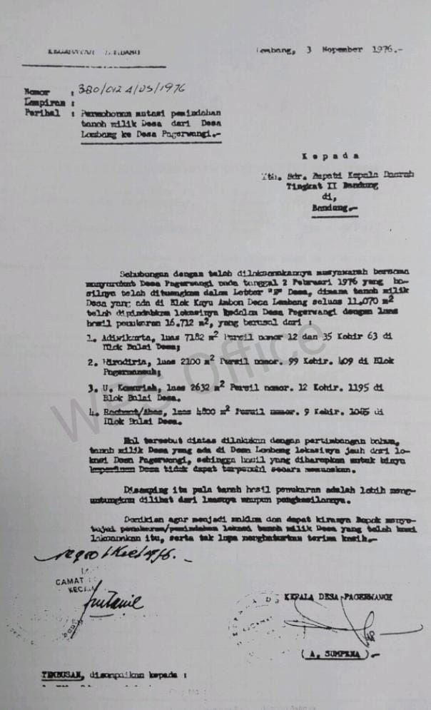 2. Foto copy (Tanpa ada Aslinya) Surat permohonan mutasi pemindahan tanah milik Desa dari Desa Lembang ke Desa Pagerwangi yang ditandatangani langsung oleh Kepala Desa Pagerwangi, Atang Sumpena tertuju kepada Bupati Kepala Daerah Tingkat ll Bandung tertanggal 3 November 1976.