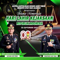 “Selamat Hari Lahir Kejaksaan RI yang ke – 80 Tahun 2025, semoga Kejaksaan Republik Indonesia semakin jaya dan profesional dalam menjalankan tugasnya untuk menegakkan supremasi hukum di negeri ini. Kami, dari Kepolisian Resor Aceh Timur, terus siap bersinergi dengan Kejaksaan Negeri Aceh Timur dalam penegakkan hukum,” ujar Kapolres, Selasa, (02/09/2025).