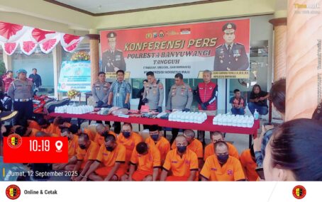 Polresta Banyuwangi di bawah kepemimpinan Kapolresta Kombes Pol Rama Samtama Putra, S.I.K., M.Si., M.H. kembali menunjukkan komitmennya dalam memutus mata rantai peredaran narkoba di Bumi Blambangan. Melalui operasi Tumpas Semeru yang digelar sejak 30 Agustus hingga 10 September 2025, aparat berhasil mengungkap 37 kasus dengan total 43 tersangka, Jumat (12/8/25).