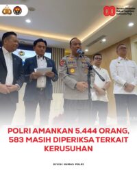 Polri mengamankan sebanyak 5.444 orang terkait aksi demonstrasi dan kerusuhan yang terjadi di berbagai daerah pada akhir Agustus 2025. Dari jumlah tersebut, sebanyak 4.800 orang telah dipulangkan, sementara 583 orang lainnya masih menjalani pemeriksaan lebih lanjut.