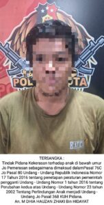 Atas perbuatannya, pelaku dijerat dengan Pasal 76C jo Pasal 80 UU No. 17 Tahun 2016 tentang Perlindungan Anak serta Pasal 368 KUHP tentang Pemerasan
