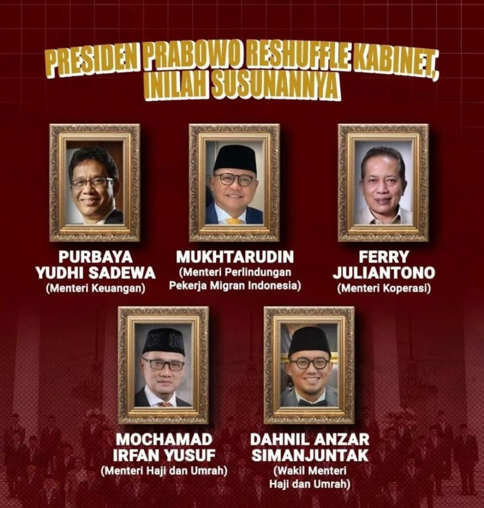 Presiden Prabowo Subianto kembali melakukan reshuffle kabinet untuk kedua kalinya. Sore ini, Prabowo resmi melantik sejumlah menteri baru di Istana Negara, Jakarta Pusat, Senin (8/9/2025).