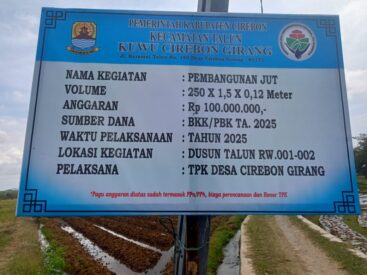 Proyek pembangunan jalan usaha tani (JUT) di Desa Cirebon Girang, Kecamatan Talun, Kabupaten Cirebon, yang bersumber dari Bantuan Keuangan Khusus (BKK/BPK) Tahun Anggaran 2025 dengan nilai pagu Rp100 juta, diduga kuat dikerjakan asal jadi dan tidak mengutamakan kualitas.
