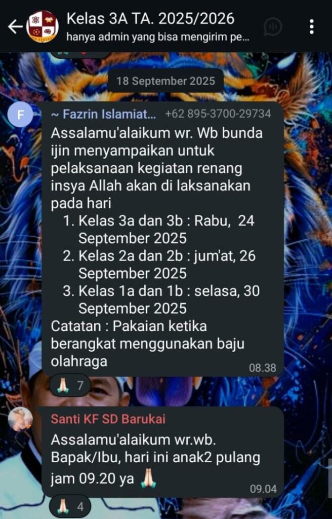 “SDN Barukai hari Rabu (24/9/2025) besok mau mengadakan renang, memang sudah diperbolehkan Pak Gubernur? Anehnya, setelah ada informasi yang disampaikan, group WhatsApp itu di matikan oleh admin group, Bu Santi,” ungkapnya, pada Senin (22/9/2025).