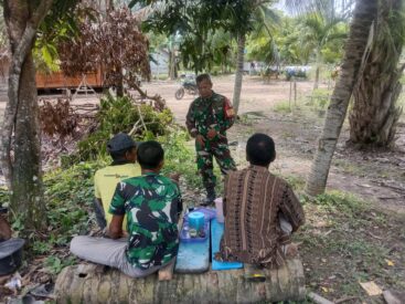 Babinsa bersama Pelda S. Sinaga melaksanakan Komsos dengan masyarakat di wilayah binaannya sebagai bagian dari upaya menjaga hubungan baik antara TNI dan masyarakat.