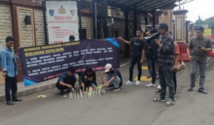 Ratusan Mahasiswa yang tergabung dalam Gerakan Mahasiswa Pemerhati Kebijakan Kepolisian (GMPKK) menggelar Aksi solidaritas terhadap Media Papuanewsonline.com di Papua yang dibungkam oleh Polres Mimika, Polda Papua Tengah, di depan Gedung Mabes Polri, Jakarta Selatan, Rabu (1/10/2025).