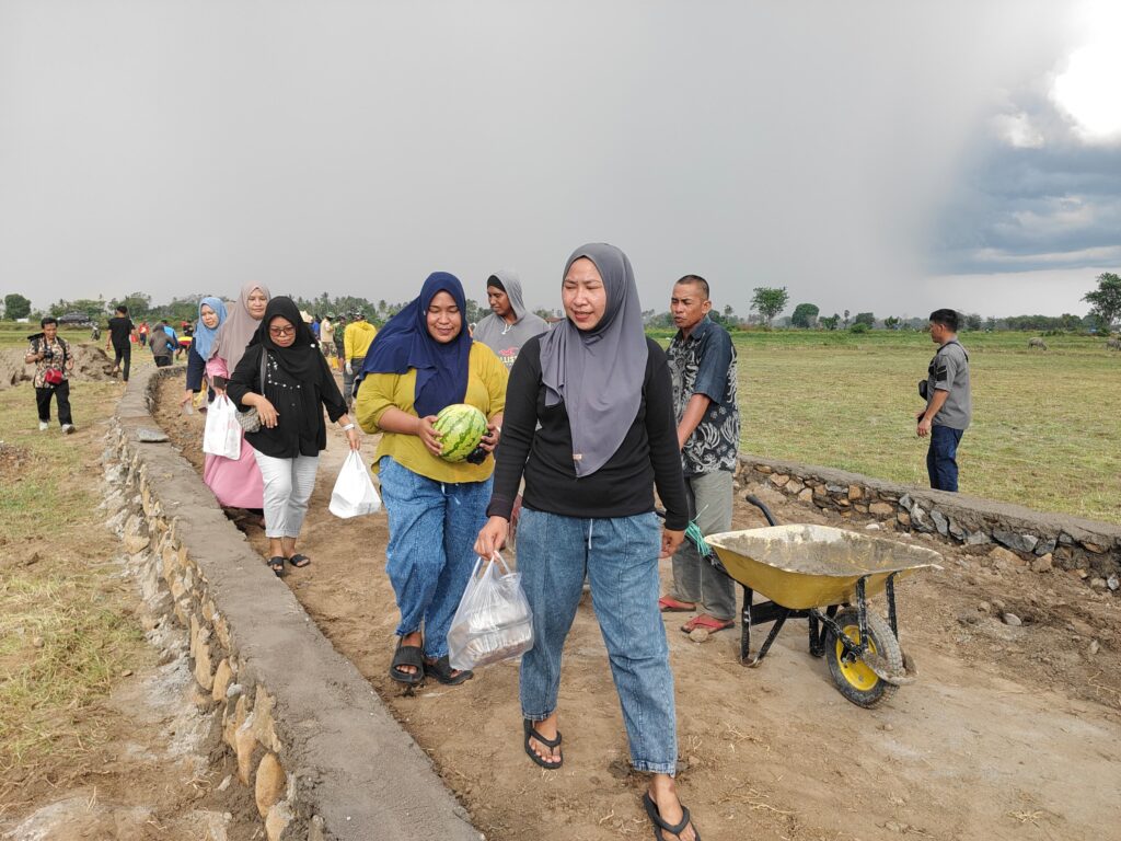 Kedatangan kaum emak-emak ini diprakarsai oleh ibu kepala Desa, ia membawa bungkusan berisi sejumlah makanan, buah dan minuman ringan. Tak lupa pula teh manis dan kopi hangat disuguhkan kepada para personil Satgas TMMD dan masyarakat yang sedang mengerjakan sasaran fisik pengerasan jalan.