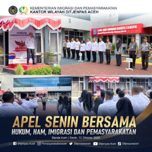 Jajaran Kantor Wilayah Ditjen Pemasyarakatan Aceh, Kanwil Kemenkum Aceh, dan Kanwil Ditjen Imigrasi Aceh ,Apel pagi kali ini dipimpin oleh Kepala Kanwil Ditjen Pemasyarakatan Aceh, Yan Rusmanto.(13,10,2025).