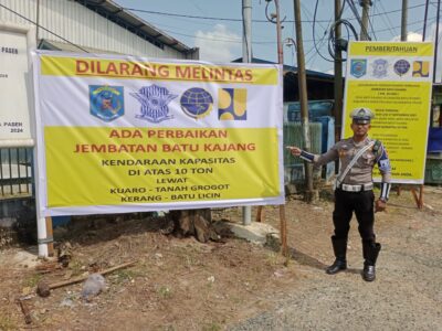 Satuan Lalu Lintas (Satlantas) Polres Paser memberikan imbauan kepada masyarakat, khususnya pengemudi truk bermuatan berat, terkait pengalihan arus lalu lintas akibat perbaikan Jembatan Batu Sopang di Kecamatan Kuaro, Kabupaten Paser, Jumat (10/10/2025).