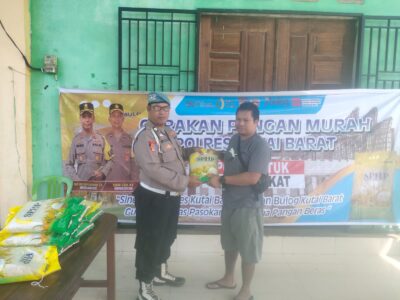 Kapolsek Barong Tongkok AKP Sunarto, S.H. bersama anggota turut berpartisipasi dan membantu kelancaran kegiatan Gerakan Pangan Murah yang dilaksanakan pada hari Senin, 20 Oktober 2025, bertempat di Kantor BPU Kampung Mencimai, Kecamatan Barong Tongkok, Kabupaten Kutai Barat.