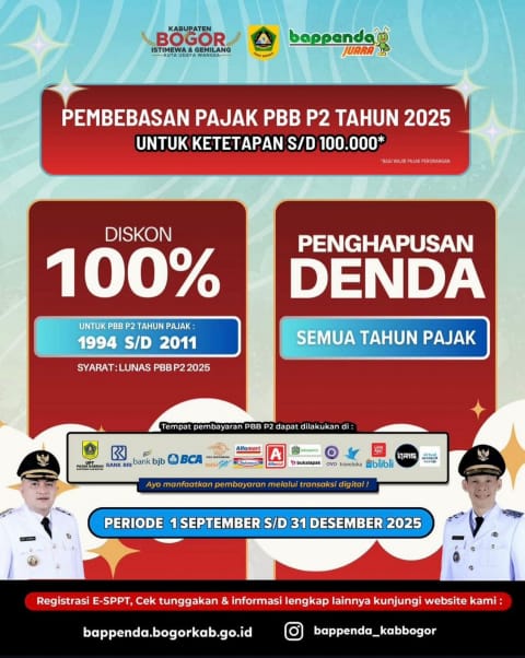 Mulai 1 September hingga 31 Desember 2025, masyarakat dapat memanfaatkan diskon 100% untuk PBB P2 tahun pajak 1994 hingga 2011, asalkan telah melunasi PBB P2 tahun 2025. Untuk wajib pajak yang nilai ketetapan pajaknya maksimal Rp100.000,- Pemerintah Kabupaten Bogor memberikan pembebasan penuh: pajak dianggap langsung lunas untuk tahun 2025 tanpa perlu melakukan pembayaran lagi dan kebijakan ini berlaku tanpa batas waktu.
