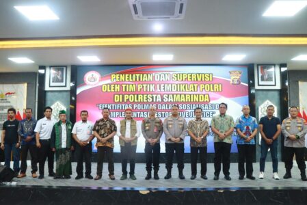 STIK Lemdiklat Polri melaksanakan kegiatan penelitian supervisi di wilayah Polda Kaltim dengan fokus pada efektivitas Polmas dalam sosialisasi dan implementasi Restorative Justice. Kegiatan ini berlangsung pada Rabu (22/10) pukul 19.00 WITA, bertempat di Aula Rupatama Polresta Samarinda.