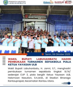 Wakil Bupati Labuhanbatu, H. Jamri, S.T., menghadiri pembukaan turnamen sepakbola tingkat SLTA/sederajat Cup 3, piala bergilir Ketua Yayasan ULB, Halomoan Nasution, S.H., M.M. Turnamen ini akan berlangsung mulai 6 Oktober hingga 30 Oktober 2025 mendatang dan diikuti oleh 45 peserta.