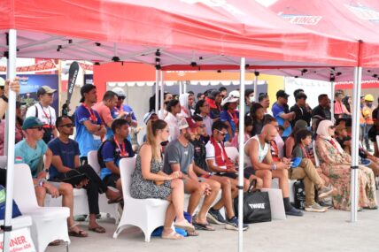 Wakil Bupati Samosir, Ariston Tua Sidauruk, menyerahkan hadiah dan trofi kepada para juara ajang Trail Of The King (TOTK) yang digelar di kawasan Water Front Pangururan, (19/10).
