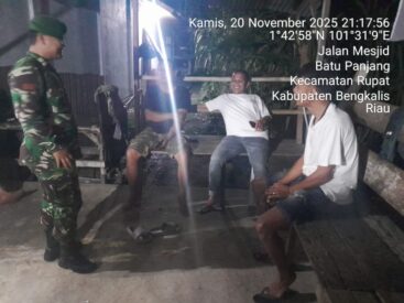 20 November 2025 Dalam rangka meningkatkan keamanan dan kesiapsiagaan lingkungan, Koramil 04/Rupat bersama Ketua RT, anggota Linmas, serta para pemuda setempat melaksanakan patroli mitigasi atau siskamling di wilayah Kelurahan Batu Panjang, Kecamatan Rupat, Kabupaten Bengkalis pada Kamis malam (20/11).