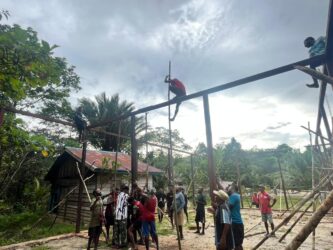 Dalam rangka mempererat hubungan dengan masyarakat, personel Satgas Pamtas RI-PNG Kewilayahan Yonif 763/SBA Pos Joshiro melaksanakan kegiatan memberikan bantuan berupa bahan bangunan untuk mendukung pengerjaan bangunan gereja baru di kampung Arsmin (19/11/2025).