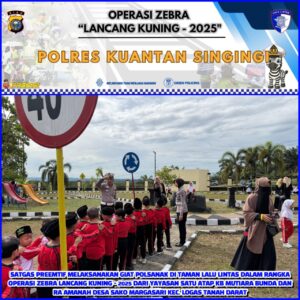 Satgas Preemtif Satlantas Polres Kuantan Singingi melaksanakan kegiatan Polisi Sahabat Anak (Polsanak) bersama murid Yayasan Satu Atap KB Mutiara Bunda dan RA Amanah Desa Sako Margasari di Taman Lalu Lintas Mapolres Kuansing. Kegiatan yang berlangsung ini merupakan bagian dari rangkaian Operasi Zebra Lancang Kuning 2025, pada pukul 08.30 WIB, Senin (24/11/2025).