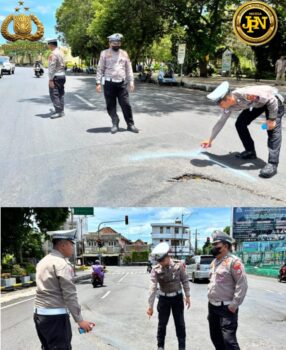 Menyikapi banyaknya keluhan masyarakat soal jalan berlubang di depan Masjid Agung Baiturrahman Banyuwangi, Satlantas Polresta Banyuwangi bergerak cepat dengan melakukan patroli jalan berlubang, Kamis (06/11/2025). Langkah ini dilakukan untuk mencegah potensi kecelakaan lalu lintas serta meningkatkan kewaspadaan pengendara di kawasan padat aktivitas tersebut.