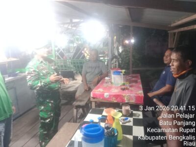 Dalam rangka menjaga keamanan dan ketertiban masyarakat, TNI bersama Ketua RT/RW, anggota Linmas, serta pemuda setempat melaksanakan patroli mitigasi Sistem Keamanan Lingkungan (Siskamling) di wilayah Koramil 04/Rupat, Kelurahan Batu Panjang, Kecamatan Rupat, Kabupaten Bengkalis.