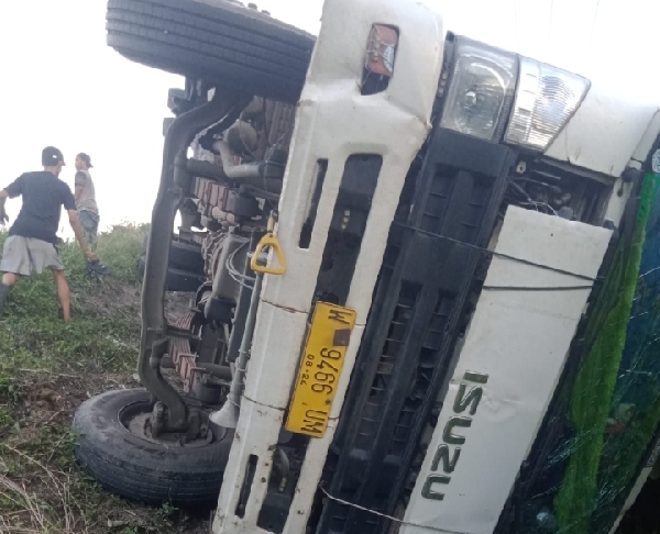 Akibat Supir Mengantuk Mobil Box Muatan Sembako Terbalik.