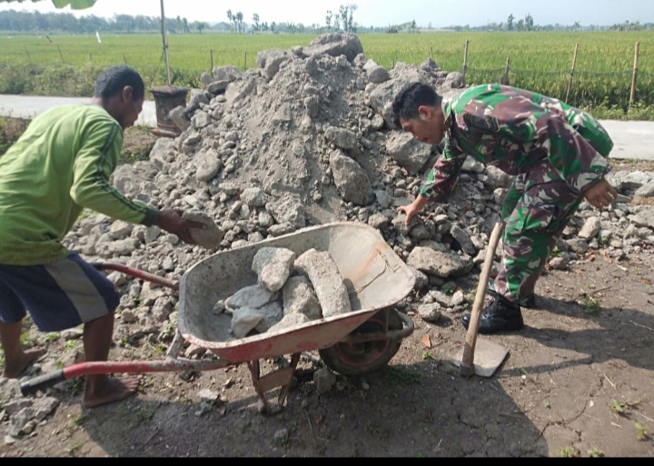 Babinsa Berikan Semangat Kepada Warga Saat Pembereman Jalan