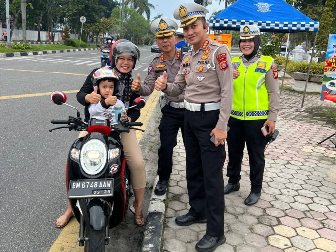 DIRLANTAS POLDA Riau Bagikan Helm Gratis dan Ajak Pengendara Jadi Pelopor Keselamatan.