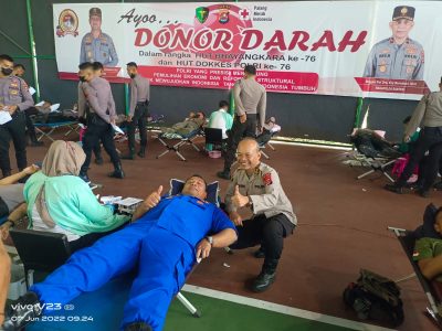 Serang –jurnalpolisi.id Dalam rangka menyambut Hari Bhayangkara ke-76 dan HUT Dokkes Polri ke-76, Dirpolairud Polda Banten Kombes Pol Giuseppe Reinhard Gultom mengikuti bakti sosial donor darah yang dilaksanakan di Lapangan Tennis Indoor Polda Banten pada Selasa (07/06). Kegiatan donor darah dipimpin langsung Kapolda Banten Irjen Pol Prof. Dr. Rudy Heriyanto didampingi Wakapolda Banten Brigjen Pol…