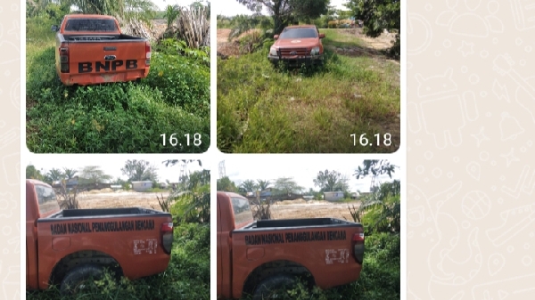 Di Duga Mobil Dinas BNPB Pelalawan, Ditelantarkan Hingga Ditumbuhi Semak Di Bekas Sebuah Bengkel.