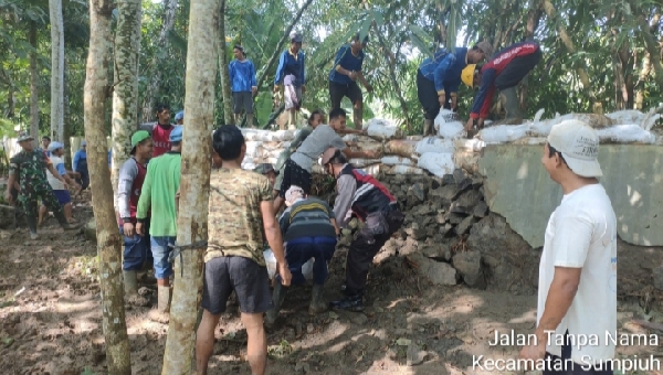 Gotong Royong Bersama Warga, Polsek Sumpiuh Banyumas Evakuasi Tanggul Saungai yang Jebol