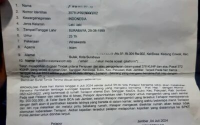 Jember, – jurnalpolisi.id Merasa ditipu ratusan juta, Ahmad warga Surabaya melaporkan komplotan dugaan tindak pidana penipuan dan Penggelapan ke mapolres Jember pada kamis 04 juli 2024. Menurut keterangan korban (Ahmad), Awalnya ia ditawari Membeli tembaga kuningan senilai 200 juta dengan tonase 2,5 ton. “Awal mendapatkan informasi tersebut dari Suyanto (teman korban) bahwa ada tembaga kuningan…