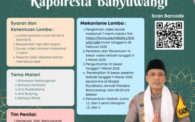 Banyuwangi – jurnalpolisi.id Menjelang bulan Suci Ramadhan 1446 H tahun 2025, Kepolisian Resor Kota (Polresta) Banyuwangi Polda Jatim akan menggelar Lomba Da’i Cilik Kapolresta Banyuwangi yang diselenggarakan oleh Sat Binmas Polresta Banyuwangi. Kepala Kepolisian Resor Kota (Kapolresta) Banyuwangi Kombes Pol. Rama Samtama Putra., S.I.K., M.Si., M.H melalui Kasat Binmas Kompol Toni Irawan, S.H., M.H., saat…