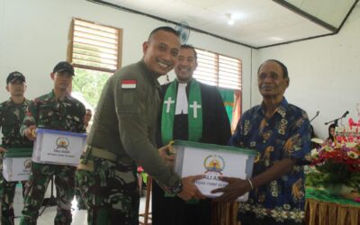 Menjelang Purna Tugas, Satgas Yonif 623 Ibadah Bersama Masyarakat Bagikan Alkitab dan Sembako