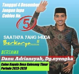 Takalar-jurnalpolisi.id Sudah lama berjuang bersama keluarga, kerabat, dan simpatisan dan toko Agama,toko masyarakat dan toko pemuda di desa Galesong Timur,terbukti sudah berkat perjuangan dan doa bersama masyarakat Galesong Timur dan toko-toko terkemuka sehingga unggul dalam kontestan pilkades serentak di takalar Hari ini yang me peroleh suara tertinggi yaitu no Urut lima(5) di Gelar minggu tgl…