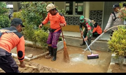 Pasca Banjir, Polres Ponorogo Bersama TNI dan Warga Bersihkan Sungai di Jembatan Tempuran