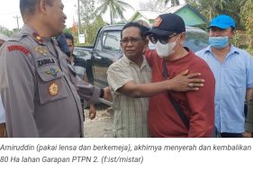 Deli Serdang – jurnalpolisi.id Hari ketiga pelaksanaan okupasi (pembersihan lahan) PTPN2 di lahan HGU 103 Kebun Bulu Cina Pasar VII Dusun XX dan XI Desa Bulu Cina Kecamatan Hamparan Perak Kabupaten Deli Serdang membuat tokoh sentral Kelompok Tani Batang Beluh, Amiruddin bertekuk lutut. Iapun mengembalikan lahan sawit seluas 80 hektar yang selama ini dikuasainya. Kepada…