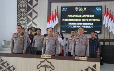 Luwu – jurnalpolisi.id Polres Luwu berkomitmen mewujudkan seleksi penerimaan anggota Polri yang bersih, transparan, akuntabel, dan terpercaya (BETAH). Komitmen ini diwujudkan dalam kegiatan pengambilan sumpah dan penandatanganan pakta integritas rekrutmen terpadu anggota Polri tahun anggaran 2025 yang digelar di Aula Tebbake Tongngenge Polres Luwu, Jumat (7/3/2025). Kegiatan ini dipimpin oleh Wakapolres Luwu Kompol Misbahuddin yang…