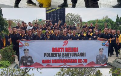 Banyuwangi – jurnalpolisi.id Menyambut Hari Bhayangkara ke-79, jajaran Polresta Banyuwangi melaksanakan kegiatan bakti religi dengan membersihkan lingkungan Taman Makam Pahlawan (TMP) Wisma Raga Satria, Jumat (20/6/2025). Kegiatan ini dipimpin oleh Kepala Bagian Sumber Daya Manusia (Kabag SDM) Polresta Banyuwangi Kompol Akhmad Ali Masduki,S.H., M.H., dan melibatkan puluhan personel dari berbagai satuan fungsi. Dengan mengenakan seragam…