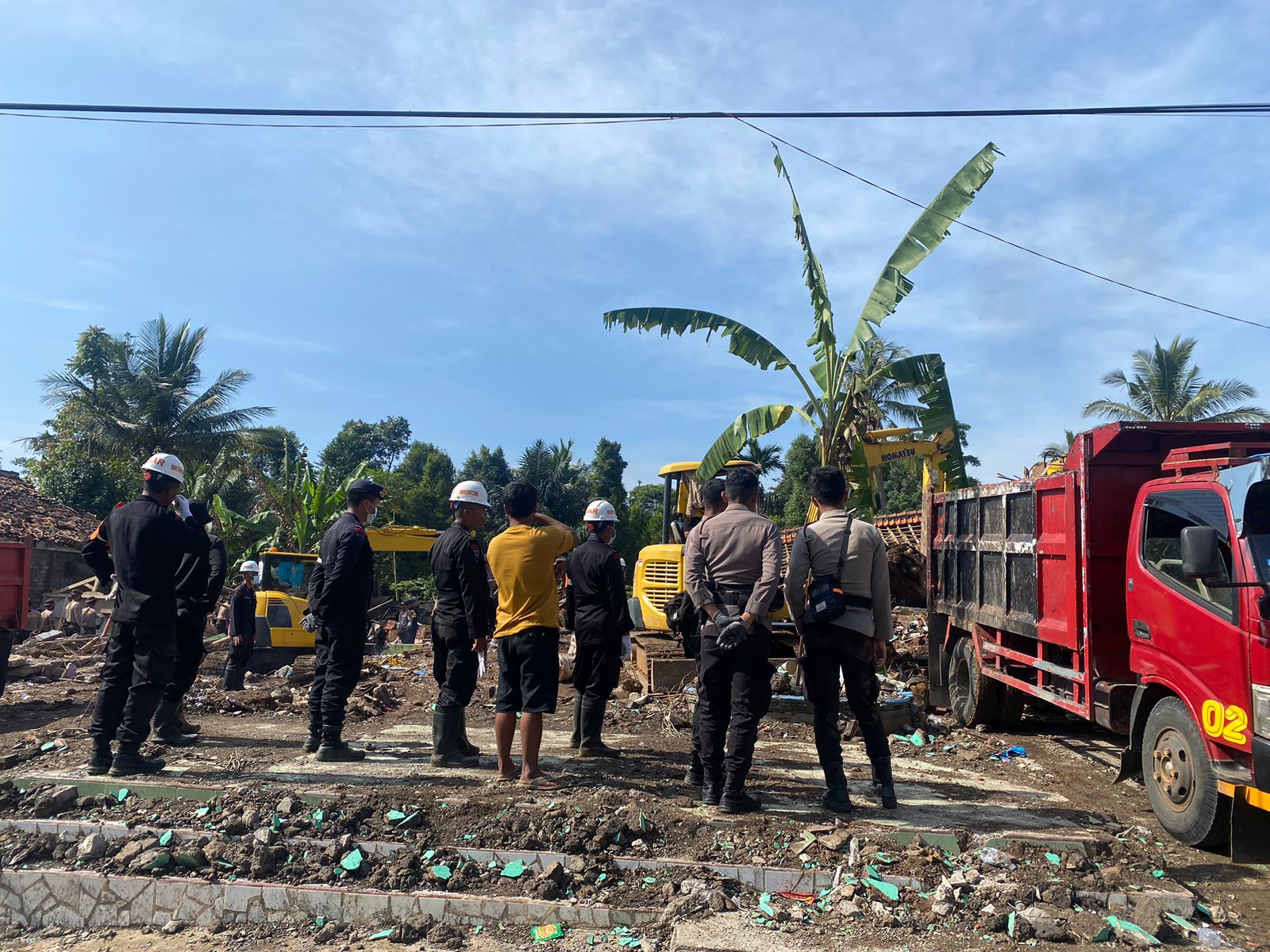 SAT BRIMOB POLDA JABAR BERSIHKAN PUING-PUING RUMAH MASYARAKAT CUGENANG PASCA GEMPA CIANJUR