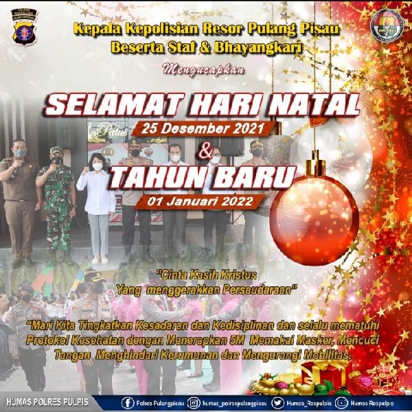 Pulang pisau – jurnalpolisi.id Kepala Kepolisian Resor Pulang Pisau dan jajaran mengucapkan Selamat Natal 25 Desember 2021 dan Selamat Tahun Baru 1 Januari 2022, semoga dalam menyambut tahun baru 2022 kami pihak kepolisian khususnya di wilayah hukum polres pulang pisau menghimbau kepada warga masyarakat dalam merayakan natal dan tahun baru 2022 agar mematuhi protokol kesehatan….